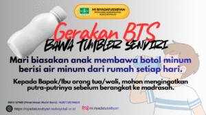 Penggung 13 Januari 2026– MI Riyadatussibyan Penggung memberikan himbauan kepada seluruh siswa untuk membiasakan membawa tumbler atau botol minum sendiri dari rumah setiap hari sekolah. Himbauan ini bertujuan untuk menanamkan kebiasaan hidup sehat, mandiri, serta peduli terhadap lingkungan sejak usia dini.